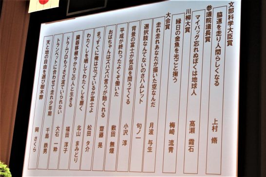 (※)セレモニーの内の1つが、【川柳文学賞】の表彰。これは昨年度に出版された句集から選考委員5名によって選出されたもの。受賞者は【文学賞・德永政二】【準賞・黒川孤遊 赤松ますみ】。席上で雫石隆子選考委員長が選考経過報告。