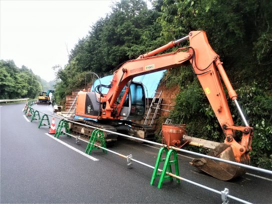 写真4、本日の夕刻散歩にて。小雨だったので傘を差して歩き出したが途中で止んだ。総合公園外周の農道に出たら、何度かアップしたことがある土砂崩れの現場、ようやく修理にかかっていた。素人目には簡単な工事だと思うのだが、重機が2台も置いてあった。人手不足を機械で補っているのだろう。本日、昼前と夕刻散歩で7697歩。