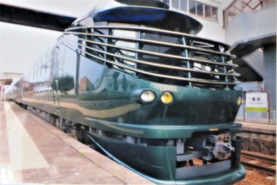 写真2、先日のブログで書いた「瑞風(みずかぜ)」の精悍なフロント。撮り鉄(トリテツ)の知り合いがプレゼントしてくれた1枚。写真の右奥に「浦安」という駅名が小さく見えるが、試運転で「浦安駅に到着する」という情報を得て早朝に撮ったらしい。