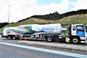 写真3、いつぞや、大阪からの帰路。もうすぐ河原SAというところで猛烈な睡魔に襲われたので、直近の用瀬PAに入ったとき停まっていたタンクローリー(ガスローリー?)。こんなデカイ(長い)のは初めて見た。
