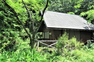 写真1、山小屋への細い道に入る手前の県道脇の紫陽花。2、小屋の西端からの眺望。雑木が伸びて視界が悪くなってきたが、崖の途中に生えているので、独力での伐採は危険。 3、朽ちて穴が開いたテラスから雑草が顔を出していた。4、2段目の土地。藤棚が朽ちたあとは放置したままで、半分ほどは笹や竹が進出して原始に戻りつつある。5、支柱を取り付けたら宇宙芋の蔓が「ありがとうございました!」と頭を垂れていた。
