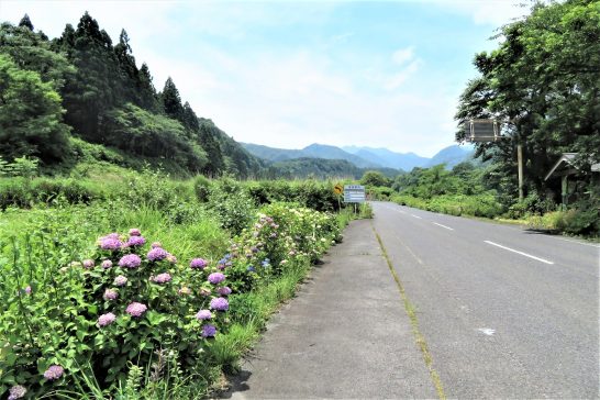 写真1、山小屋への細い道に入る手前の県道脇の紫陽花。2、小屋の西端からの眺望。雑木が伸びて視界が悪くなってきたが、崖の途中に生えているので、独力での伐採は危険。 3、朽ちて穴が開いたテラスから雑草が顔を出していた。4、2段目の土地。藤棚が朽ちたあとは放置したままで、半分ほどは笹や竹が進出して原始に戻りつつある。5、支柱を取り付けたら宇宙芋の蔓が「ありがとうございました!」と頭を垂れていた。