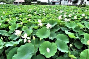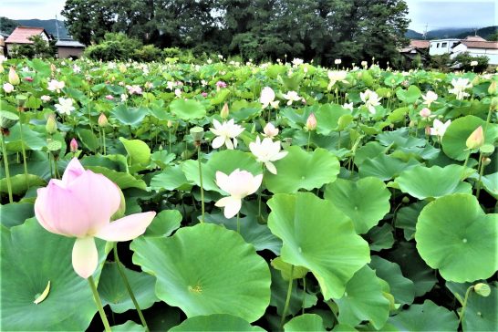 そうですか、蓮池、入れ違いだったのですね。私が行ったときは、役場の横の「蓮池・駐車場」と書いた看板のパーキングは私の車だけでした。その駐車場から見たら「蓮の花」らしきものが見えたので、そちらへ歩いて行きました。が、上にも書いていますように「水面近くで咲いている」というイメージしかなかったので「はて?」と思っていたら、ちょうどワンちゃんと散歩しているご婦人が通りがかったので確認すると「はい、ここです」ということでした。