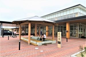 足湯、私が見たときは、写真のようにスマホを見ている青年とその向こうに母娘と、3人が入っていました。過日出かけたご婦人の感想は「外からもレストランからも丸見えで恥ずかしい」と言っていました。