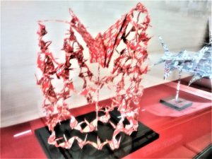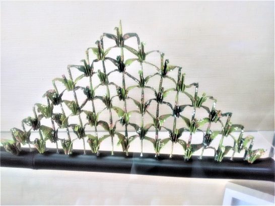 へ~、「1枚の紙から切れ目なく折られた…」そういうのもあるのですね。何も知らず何も考えず、ただ「おう珍しい!」と思ってパチリと撮っただけです。   1つ目のは沢山の折鶴をボンド?でピラミッド状にくっつけたように見えました。2つ目のは、今度行ったときにでも問屋さんに確認しておきます。