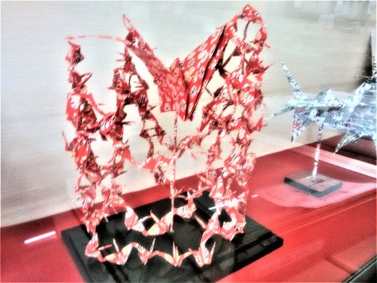 午後2時より、5F研修室にて【日川協常任幹事会】。新メンバーも加わっていつもより賑やか。出席は19名?。議事いろいろあったが3時30分頃?終了。帰路、加西SAと河原SAにて小休止。帰宅は7時30分頃。本日、梅地下ブラブラ&問屋街ブラブラで10,041歩。                             写真12、行きつけの紙問屋のショーケースに飾られていた「千羽鶴」を立体的に構成したもの。他にもいくつかあったが、取り敢えず2つご紹介。3、帰路の加西SAの「仲良しベンチ」。「帰っても1人でしょう。ゆっくり休んでゆきなさいよ」と言っていた。   4、自宅まであと6キロほどの北栄町にて、夕映えをバックにした風車。