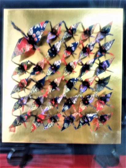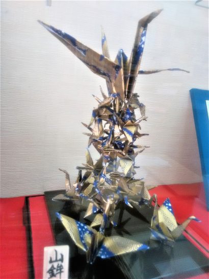 この写真のような折り鶴が1枚の紙から作られているとは信じられないのですが…、上にも書いていますように、最大97羽も折れるとのことです。(展示している問屋さんに確認しなければいけませんが…)