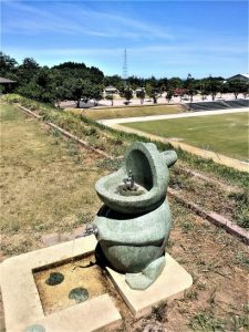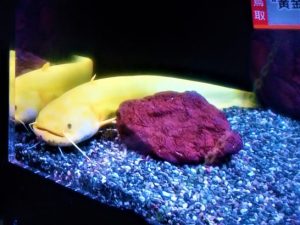 写真2、午前11時30分頃、昼前の総合公園にて。いつもは写真右下の芝生あたりを歩くが、今日は陽射しがきつかったので写真左の木陰の道を歩いた。34、途中でハンカチを濡らした水飲み場。ぬるい水しか出てこなかったが首に巻くと「すずし~~い!」。   5、本日、NHK総合のローカルニュースで、体長55センチの【黄金のナマズ】が紹介されていた。捕獲されたあと、鳥取市賀露の「かにっこ館」で飼育中とのこと。      本日、昼前と夕刻の散歩(濡れたハンカチを首筋に当てながら)で7,458歩。