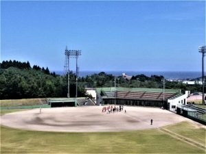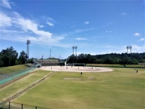 写真2、昼前散歩で総合公園の野球場の上にきたら、丁度2チームが向かい合って挨拶するところでスコアボードから「ウ~~!」とサイレン。時刻を見ると12時10分前だったので「試合が終わったところか」と思って歩いていたら、試合が始まった(写真3)。