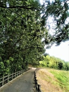 超大型の台風10号がこちらに向かっています。皆さん充分にご注意下さい。夕刻の散歩では台風の影響なのかときどき強い風で遊歩道の枝が大きくしなっていた(写真4)。   本日、昼前と夕刻散歩、いずれも濡らしたハンカチを首に巻いて7,455歩。