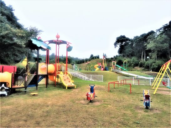 本日、最高気温も32℃、昼前散歩でもハンカチを濡らして首に巻くのは冷たすぎてヤメ。また、夕刻散歩に出かけようとしたら小雨。で、傘を差して歩き出したが15分も歩いたら、傘が重たくなってきた。が、ちょうど雨も止んできたので、畳んで振り回しながら歩く。本日、昼前と夕刻散歩で7,460歩。 写真:夕刻の「子ども広場」。小雨だったので誰もいなかった。
