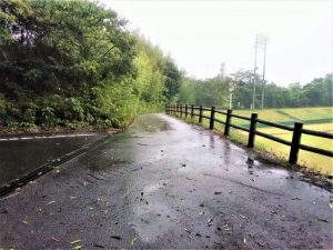 昨夜は窓を開けて寝ていたら、朝方にハックション! 午前10時頃までは涼しかった が11時20分頃に散歩に出かけたら「蒸し暑い!」。で、総合公園の水飲み場(写真1)で ハンカチを濡らして首筋に当てて「快適~~!」。夕刻散歩の午後5時30分にも、同じ水飲み場で同じようにして歩き出したら、10分もしない内に雨。最初は小降りだったが、「そんなに暑ければ冷やしてやろう!」とでも言うように土砂降りになって(写真2、3、写真では雨粒が見えないが)、シャツからズボンまで全身グッショリ。おかげで「涼し~~い」のを通り越して「ちょっと寒い!」となってしまった。だが、駐車場からいちばん遠い位置だったので、無駄な抵抗はせずゆっくり歩いて車まで。帰宅してパンツまで着替えて、ほっと一息。本日7,556歩。