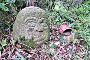 写真1、里では好天だったが山に行くと曇天だった。2、坂道の上に鎮座している石花菜作のメダマ地蔵。右は私が作ったアンコウ。誰が入れたのか、口にお賽銭が入っている。