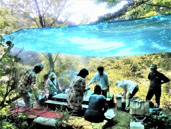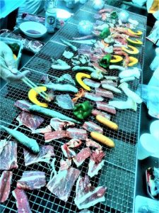 本日、午前11時30分に浦安駅前集合にてバーベキュー。皆さんの日頃の精進のお蔭か、長雨の合間の奇跡的な快晴! 世話役の芳山さんが、自由参加というスタイルで進めたので「何人ぐらい来るのか?」「車に乗れるのか?」など、当日まで分からなかった。が、集合したのは昨年より少し多い12名(男性8・女性4)。乗用車3台でバッチリ。11時45分出発。山小屋着は12時15分ほど。雨除けのつもりのブルーシートは日除けになった(写真上)。バーベキューの網など全体に青っぽいのは、太陽光線がブルーシートを通している所為。皆さんがテキパキ段取りしてくれるので、準備もスムーズに進行。炭に着火するまで少し時間がかかるのは例年通り、燃えだすと火力バンバン。ビールとウーロン茶でカンパイ後は愉快に談笑。私はビールで乾杯後、黒霧の湯割りガンガン。 ・写真上、網の向こう端に見えるシルバーのボール3個ほどは、大きな玉葱を丸ごとアルミホイールで包んだもの。その他、あらかじめカボチャを切って持って来てくださったり。買い物を初めさまざまな段取り、お世話になりました~~~!