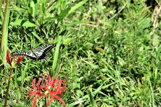 写真上:本日の昼前散歩にて。総合公園へ向かう途中の田圃で彼岸花らしい赤がチラッと見えたので、駐車場に車を置いてからぶらぶら散歩でバック。パチパチ写していたら、上空に飛行機雲が現れたので、これも一緒にパチリ。とやっていたら「わたしも写して…」と、てふてふがひらひらやってきたので、これもパチリ。本日7,248歩。