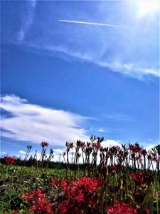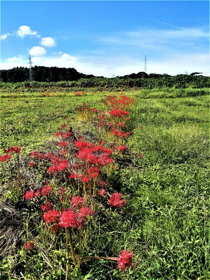 3枚目の写真、ふと気がついたら、飛行機雲が西から東へ進んでいたので、何とか「彼岸花と一緒に…」と思って、畑に膝をついて、下から空を見上げる角度で摂りました。なんとか両方が収まって、よかったよかった、です。