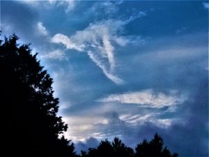 写真2、昼前の散歩にて綺麗な鱗雲3、夕刻の散歩にてV字形の雲(飛行機雲の崩れたのか?)。本日、蒸し暑かったが頑張って8,455歩。