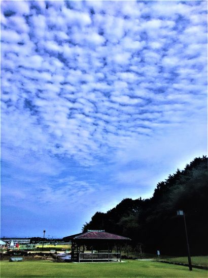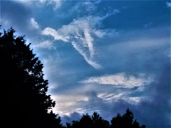 写真2、昼前の散歩にて綺麗な鱗雲3、夕刻の散歩にてV字形の雲(飛行機雲の崩れたのか?)。本日、蒸し暑かったが頑張って8,455歩。