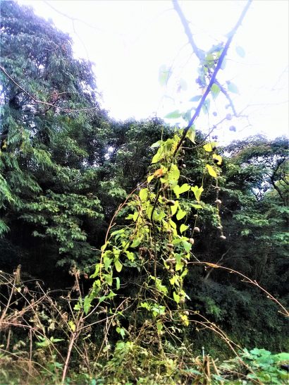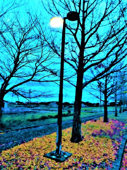 昨日から降り続いていた小雨も午前中に止んで、昼前散歩は傘不要。公園内の柿をまた1つ頂戴したら、シブも抜けていて旨かった。公園外周ではムカゴがいっぱい採れた。が、手の届かないところでデカイのが揺れていてザンネンだった(写真1)。夕刻の散歩では公園の街灯の下だけ公孫樹の葉っぱが鮮やかだった(写真2)。本日、7,686歩。