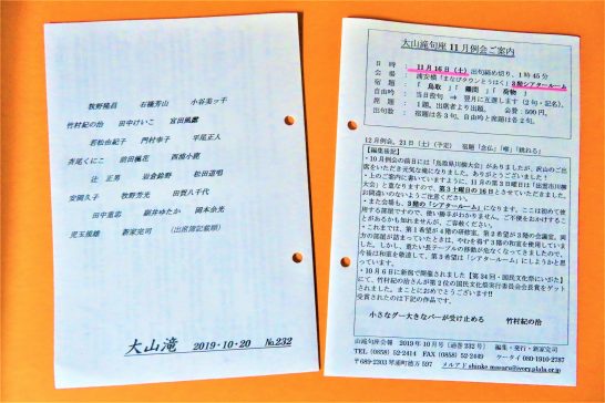 20日(日)の【大山滝句座10月例会】会報、本日完成。発送も半数完了。残り半分は明日発送。句会の後5日で会報完成&発送は全国でも最速?に近いのではないか。DNAで受け継いでいる【兵は拙速を尊ぶ】【速いがごっつぉ】の精神。と、エラソーに言っているが、表紙を含めて僅か8ページのペラペラ。製作数も60部ほど。(写真3)。