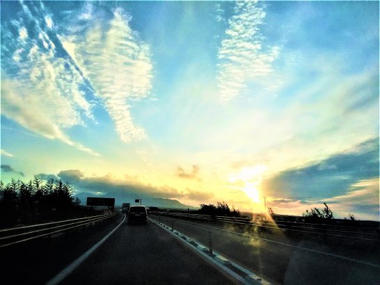夕焼けの写真、もう少しで私が降りる「琴浦東インター」という場所でした。フロントガラス越しにスマホで撮ったので、空の色などが少しだけ自然と違う感じになっているようです。