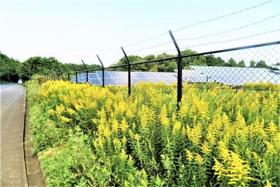 ・写真は、今日の昼前散歩。総合公園外周の農道にて「太陽光発電施設」の内外に繁殖しているセイタカアワダチソウ。雑草には鉄条網など無関係のようだが、これ以上伸びると太陽光パネルに影を作るので、放置してはおれないだろう。本日8,351歩。