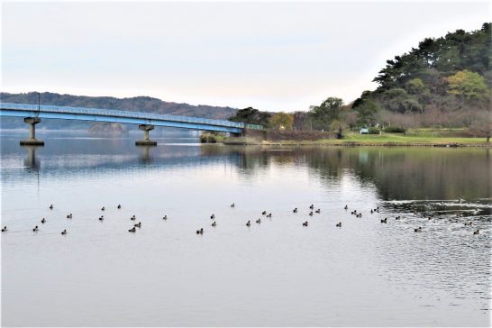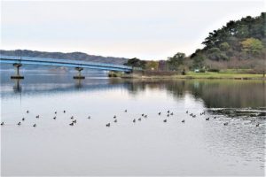 本日、第4日曜日にて「うぶみ川柳会」例会日。会場まで50分ほどだが、湖山池(日本最大の池)周辺の「秋」を撮るため、早目の昼食を済ませて12時15分前に出発。山陰道を「鳥取西インター」まで走ったが、「吉岡温泉インター」で下りて、湖山池の岸沿いに東へ進んだ方が早いかもしれない。写真1、湖山池の岸辺。2、青島と鴨?の群れ。