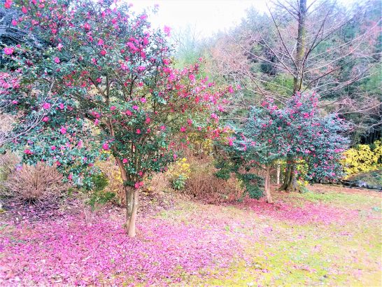 写真1、総合公園には山茶花がたくさんあって、あちこちに鮮やかなピンクの絨毯。 ・2、遊歩道の杭の上に何やら置いてあった。「釘か?」と思って近づいて見ると木の枝だった。誰が何のために?子供の仕業か?宇宙人か?