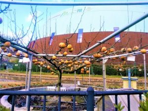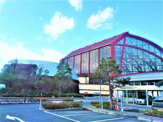 写真上、1、倉吉未来中心。左の建物「梨っこ館」。2、未来中心ドームの木製アーチ。下、3、梨っこ館の庭に成っていた梨。4、遊歩道。5、宴会の弁当(右端は茶碗蒸し)&焼酎湯割り(グラス)とビール。本日、7,179歩。