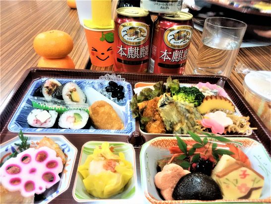 お弁当、とても旨かった! 伊達巻は無かったけど、カマボコいろいろ。毎年うれしいのは茶碗蒸し(写真では右端にプラスチックのスプーンが見えている、その下)。まだ温かで心に沁みました。