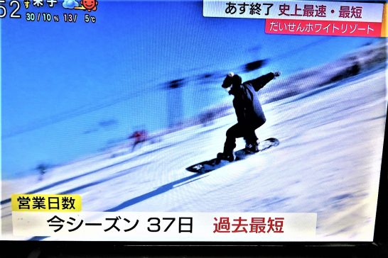写真は、本日夕刻の民放TVニュースにて。今年は暖冬で大山のスキー場も明日で終了。営業日数は最短の37日だったとのこと。近い将来、「昔は大山にもスキー場があったんだよ」ということになるのではないか。本日、7,570歩。