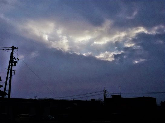 夕刻のニュースによると【センバツ高校野球中止】とのこと。頑張って練習に励んで、ようやく出場が決まった選手諸君は残念無念だろう。本当に憎らしいウイルスである。 ・本日、風が冷たかったが、昼前と夕刻散歩に出かけた。だが、夕刻散歩の途中から降り出したのでギブアップ。6,554歩。写真は帰宅してから駐車場でパチリ。雨雲の間から明かりが見えていた。明日は快晴🌞で暖かい(鳥取の最高気温16℃)との予報。