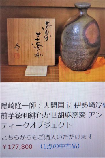 若い頃は清酒ばかり飲んでいたが、還暦前ごろに「糖尿病予備軍」(今では正規軍)になって焼酎に切り替えた。たまに宴会などでビール・酒・焼酎の「三種混合」など、無茶飲みをすることがあるが、晩酌はもっぱら焼酎の湯割り。ところが、今年の正月に到来物の清酒を燗して飲んだところ「なかなかイケる!」となって、気分によってときどき清酒をやっている。その時に使用しているのが写真1の二合徳利。ずいぶん前に岡山の柳友から頂戴して戸棚に仕舞っていたもの。使っているうちに手に馴染んで、窯変の色模様も美しく「逸品ではないか?」と思えてきた。で、先日、試みに【備前窯変徳利】で検索したら、「アマゾン」他ネットショップでそっくりのが出てきた。写真3、価格を見ると、何と177,800円とか82,500円。人間国宝とか有名作家のものだろうが、比べてみても私の方が良いように思える。持ち主の欲目であろうか…(-_-;)。              本日、昨日と打って変わって快晴で暖か。昼前と夕刻の散歩もラクチンで7,830歩。