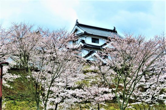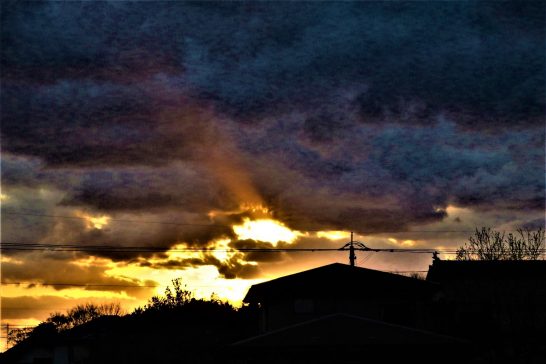 写真1、さてどこの城でしょう? このように桜が満開になると、見事な城にみえるが、これは総合公園内にある平岩記念館。(琴浦町出身の平岩國蔵さんのご遺族からの寄付金によって建てられた宿泊研修施設)2、夕刻散歩から帰った駐車場から見た夕映え。「かみさまのサーチライト」。本日7,731歩。