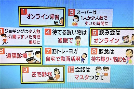 本日のNHK総合「シブ5時」のテーマの1つは、今盛んに言われている「人との接触を8割減らす」ということ。その重要ポイント10項目(写真)の内の【飲み会はオンラインで】を見て苦笑。「オンライン帰省」というのはまずまず分かるとしても、飲み会をオンラインでやって楽しいのだろうか盛り上がるのだろうか??  そういえば、少し前の「大阪2番」さんのブログに「電話で飲み会」というのがあったな~。さすがに時代の先端を走っておられる!!