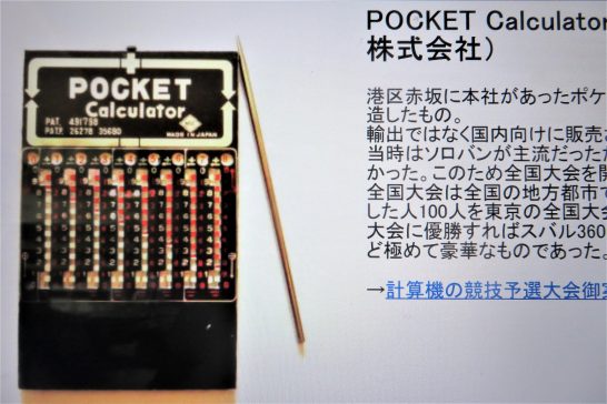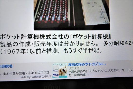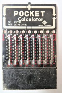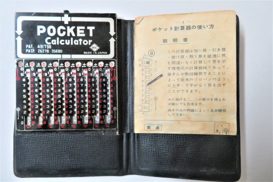 先日より取り掛かっている身辺の整理整頓。書棚とか机の上、そして引き出しの中と進めていたら【ポケット計算機】(写真1~2)が出てきた。もちろん電卓ではなく手で操作(金属のピン先を使って)するもの。写真1の黒いビニールケースの真ん中にピンが入っていたが紛失。2は計算機だけ取り出してクローズアップ。いつごろ買ったのか覚えがないので、ネットであちこち検索したら、2~3記事が出てきた。 ・写真3では操作するピンが写っている。写真4の記事によると、昭和30年代の末頃に発売されたのだろうと記されている。写真5の記事によると、昭和42年(1967)年以前の発売だろうと記されている。発売直後に購入したとは思えないので、私がゲットしたのは、発売後2年ごろと推定すると昭和42年前後(25歳前後)になる。いずれにしても、何度かの引っ越しを経ながら50年以上も残っていたとは感慨深い。本日5,121歩。