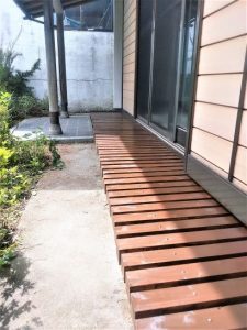 しばらく梅雨のような空模様が続いていたが、今日は久しぶりにこの季節らしく爽やかに晴れ渡った。10時前から近くの義姉宅の濡れ縁(外縁)の塗装。築後30年近くなり最近は空き家にしているので、濡れ縁の木材が腐食。過日、大工さんに修理してもらったが、塗装はこちらでやることになっていた。数日前から防腐ペイントや刷毛などを購入して段取りだけはしていたが、天候が悪かったのでようやく本日になった次第。
