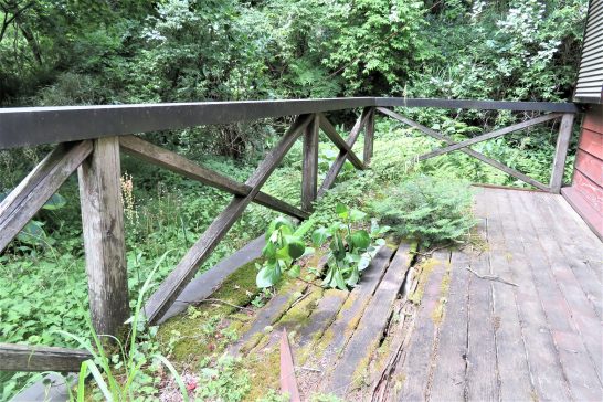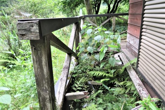山小屋、経年劣化が激しく、テラスは写真の有り様です。小屋本体は雨漏りもなく、まだ大丈夫のようですが、いずれは山に埋もれてしまうでしょう。まあ、その前に私が埋もれてしまいますが…。