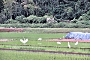 鷺は10数羽のグループでのんびりしていました。反対側の田圃では同じような形の鳥で灰色をしたのが、やはり10数羽、なにやらついばんでいました。これはアオサギではないかと思います。