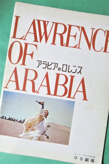 アラビアのロレンス(LAWRENCE OB ARABIA)1962年公開。イギリス・アメリカ合作。監督は「ドクトル・ジバゴ」と同じデヴィッド・リーン。出演:ピーター・オトゥール。アンソニー・クイン。オマー・シャリフ。アレック・ギネス。音楽:モーリス・ジャール。日本公開は1963年。パンフレット表紙にOS劇場とあるが、この梅田近辺はその頃(60~40年前)の私のテリトリーでしばしば出かけてはブラブラしていた。 ・アラビア半島の砂漠地帯を舞台にして、オスマン帝国からのアラブ独立闘争を壮大なスケールで描いている。印象的なシーンはいくつもあるが、遥かな点のような蜃気楼が少しずつ近づい人影になってくるシーンは3分間以上のロング。全編にわたって男臭い男ばっかりで女性は1人も出てこなっかったのではないか?