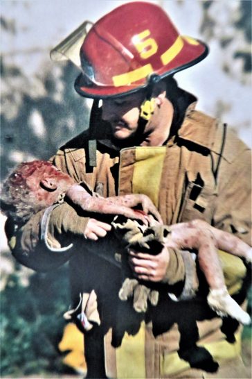先日、注文した【ピュリツァー賞受賞写真集】が到着。さっそく1996年の頁を開くと5日にアップした写真が出てきた(写真上)。意外だったのはカラーだったこと。スクラップブックに残したのは新聞の切り抜きなのでモノクロは当然だが、元の写真がカラーだったとは想定していなかった。そのせいで、幼児の頭に血がいっぱい付いているのがわかる。手や足にも血痕が見える。改めて仔細に見ると、消防士はヘルメットに着いている防火フードを持ち上げて幼児を覗き込んでいる。ゴツイ防火手袋を外して素手で抱き上げている。たった1枚の写真だが仔細に見ると消防士の優しさをはじめ多くのことが見えてくる。(もういちど見直したら、幼児の頭や手足についている血痕は鮮血ではなく少し黒ずんでいる。ということは発見されるまでに時間がかかったのかもしれない)