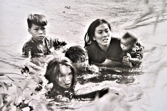ついでにもう少し、と思ってパラパラ捲ったが報道写真だけに、そのどれもが悲惨で紹介するのを躊躇うものばかり。その中で、ずいぶん前に目にしたとき、グッと胸を突かれたもの。皆さんも見覚えあると思う1枚のみ上にアップします(55年も前なので若い人は知らないかも…)。この写真は【安全への逃避】と題されたもので撮影は沢田教一。沢田はこれによって1966年にピュリツァー賞を受賞。写真はベトコンの拠点とみなされ米軍の爆撃を受け続けた村から、川を渡って逃げている母親2人と子供たち。 ・沢田教一は1936年2月22日、青森市生まれ。青森県立青森高等学校卒。1970年10月28日プノンペン郊外にて狙撃されて死去34歳(一部、ウィキペディアより)。
