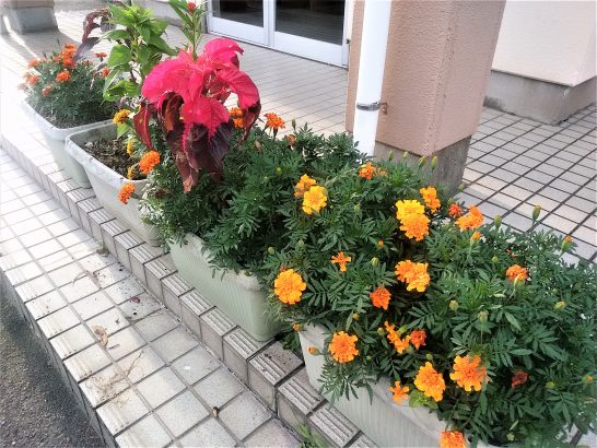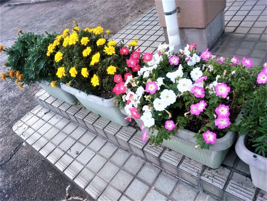 公民館前のプランターの花、四馬鹿大将のひとりが黙って世話しているとのこと。他の4馬鹿から聞きました。