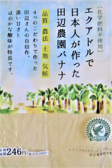 ハッハッハ、田辺農園さん! 袋の宣伝がユニークだったのでアップしました。入っていたバナナはしっかりしたキレイな黄色でシミひとつなし。やはりバナナは少しシミが出た頃のほうが旨いな、と思いながら食べました。。