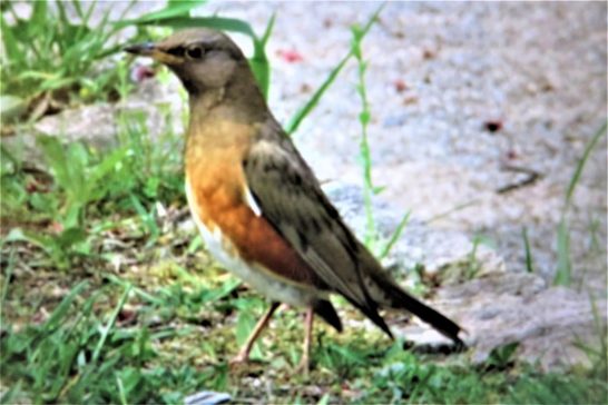 昨夕は熱帯夜ではなかったので、夜中に目覚めたときエアコンを切って、窓を開け放したら外の風が涼しかった。朝5時過ぎ、明るくなったころウトウトしていたらいろいろな囀りが聞こえてきた。花の名前に疎いが鳥の名前もあまり知らない。鳴き声で解るのはカラスと鳩とスズメぐらいなもの。鳩は5月頃、さかんに「グルーポポーグルーポポー!」と鳴いている。向かいの農協の屋上に巣があるのかもしれない。真夏でも聞こえるのはカラスの「カーカー!」とスズメの「チッチチ!」ぐらい。この囀りは「話をしているのか?」「恋人を呼んでいるのか?」「歌をうたっているのか?」「愚痴を言っているのか?」などと、ウトウトしながら二度寝。 ・ ・昼前散歩に出かける前に自室へカメラを取りに上がったら、何やら盛んに「ピーピピ~~ピーピピ~」と鳴き声がする。窓から覗いたら、隣家との間の電線に珍しい鳥が止まって鳴いていたので、望遠を効かせてパチリ(写真1)。後ほどネットの「野鳥図鑑」で調べたら、少し似ていたのが写真2の「アカハラ」。だが見比べるとやっぱり違うようだ。1の鳥をご存知の方は教えてください。大きさは鳩をスリムにしたぐらいです。 〔本日の仕事と歩数〕愛染帖PCインプット。カルチャー宿題へコメント。4,483歩。