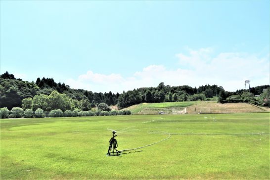 今朝4時頃に目覚めたら、開け放していた窓から「リ~リリリリリ リ~リリリリリ」というような涼やかな虫の音。虫にも疎いので、YouTubeで聞くと「エンマコオロギ」の鳴き声がイチバン近いように思った。昨日までは全く気が付かなかったので、この近辺では初鳴き?なのかもしれない。ついでにネットで調べたら気象庁の【生物季節観測値】の中に【えんまこおろぎ初鳴】⇐クリックでファイルあり)、というのがあった。この一覧表を見ると【米子】の観測ポイントの幾つかで、8月24日・25日・28日と記されている。ということは今朝の鳴き声はやはり「初鳴き」だったのだろう。昼間はまだまだ暑いが、確実に季節は移っている。だが、明日以後は連日の熱帯夜。特に27~28日の最低気温予報は27~28℃なっている。これは台風8号の所為だろう。秋はウエルカムだが台風は御免蒙りたい。台風のコースに当たっている皆さま、くれぐれもご注意ください!! 写真は昼前散歩にて。総合公園のサッカー場。長く雨が降っていないので芝生のためにスプリンクラーをかけていた。 ・ ・ ・〔本日の仕事と歩数〕しんぶん赤旗「読者の文芸」見直し後メール送稿&投函。川柳マガジン「名句鑑賞」。4,883歩。