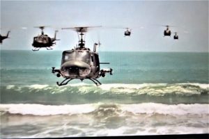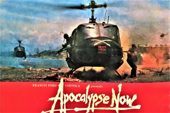 【地獄の黙示録】(APOCALYPSE NOW)1979年製作。ベトナム戦争の暗部を描くアメリカ映画。様々な恐ろしいエピソードがあるが、メインはカンボジアのジャングルで自らの王国を築いている元グリーンベレー隊長カーツ大尉(マーロン・ブランド)の暗殺計画。鮮烈に記憶しているのはワグナーの「ワルキューレの騎行」を大音響で流しながらベトナムの村を襲うヘリコプター軍団(写真6。これだけはネットより)。もう一つは、川を遡りながら出会う前線の異常な光景(写真4、5)。もう1度、大画面で観たいような、重たすぎるので観たくないような、凄い映画である。監督:フランシス・フォード・コッポラ。出演:マーロン・ブランド。ロバート・デュバル。マーチン・シーン。ハリソン・フォード。