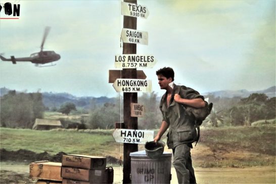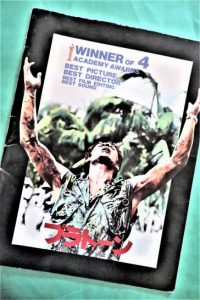 【プラトーン】(PLATOON)1986年。アメリカ映画。日本公開1987年。これもベトナム戦争におけるアメリカ兵の暗部を描く。プラトーンとは「小隊」のこと。数々の暗いエピソードを繋いでいるが、33年前のことなのであまり覚えていない。先ほどの「地獄の黙示録」は繰り返し観たのでよく覚えている。今回、パンフレットを見ていて面白いと思ったのは、写真9の傷ついた兵士(チャーリー・シーン)の横に立っている標識。「テキサス9,995㎞、サイゴン410㎞、ロスアンジェルス8,757㎞、ホンコン685㎞、ハノイ710㎞」これ、ヤンキー独特のユーモア(ブラックユーモア)だろう。リアル且つ非情且つ愉快。少なくとも大日本帝国陸軍にはなかった余裕。監督:オリバー・ストーン。出演:トム・ベンジャー。チャーリー・シーン(マーチン・シーンの息子)。