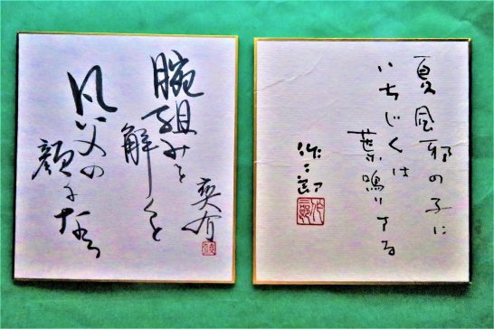 色紙や短冊を書くのは苦手中の苦手。もちろん悪筆のため。だが、どうしても逃げられないこともあり、先日、参考のためにとストックしてある先輩諸兄の色紙を取り出して拝見。中に珍しい、墨作二郎さんと小松原爽介さんのがあったのでご紹介。いずれも「寸松庵(すんしょうあん)」と呼ばれている小さい色紙。写真3。 〔本日の仕事と歩数〕川柳マガジン2020懸賞川柳【文月賞】第1次選。4,405歩。
