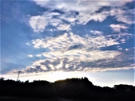本日、午後から急に黒雲が出て大粒の雨。しばらくして止んだが、急激に温度が下がって、夕刻散歩では肌寒いほど。車の外気温計では21℃。昨日より14℃も低い。急激に秋の気配だが、寝るときにエアコンも扇風機も要らないのは有り難い。写真2は、夕刻散歩での西空。〔本日の仕事と歩数〕川柳マガジン2020懸賞川柳【文月賞】2次選完了・メール送稿。6,023歩。